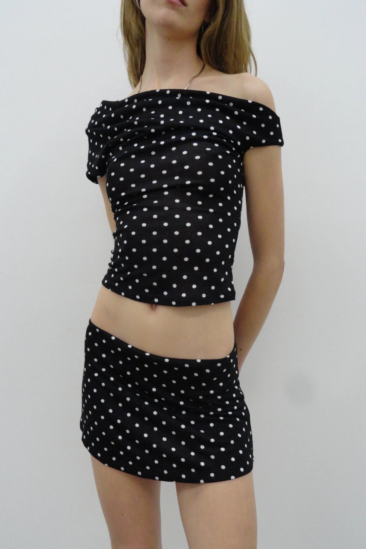 Short sleeve drape top with asymmetric neckline and sleeves. Styled with the perfect fit mini skirt with built in underwear lining in ultra soft black polka dot jersey fabric.