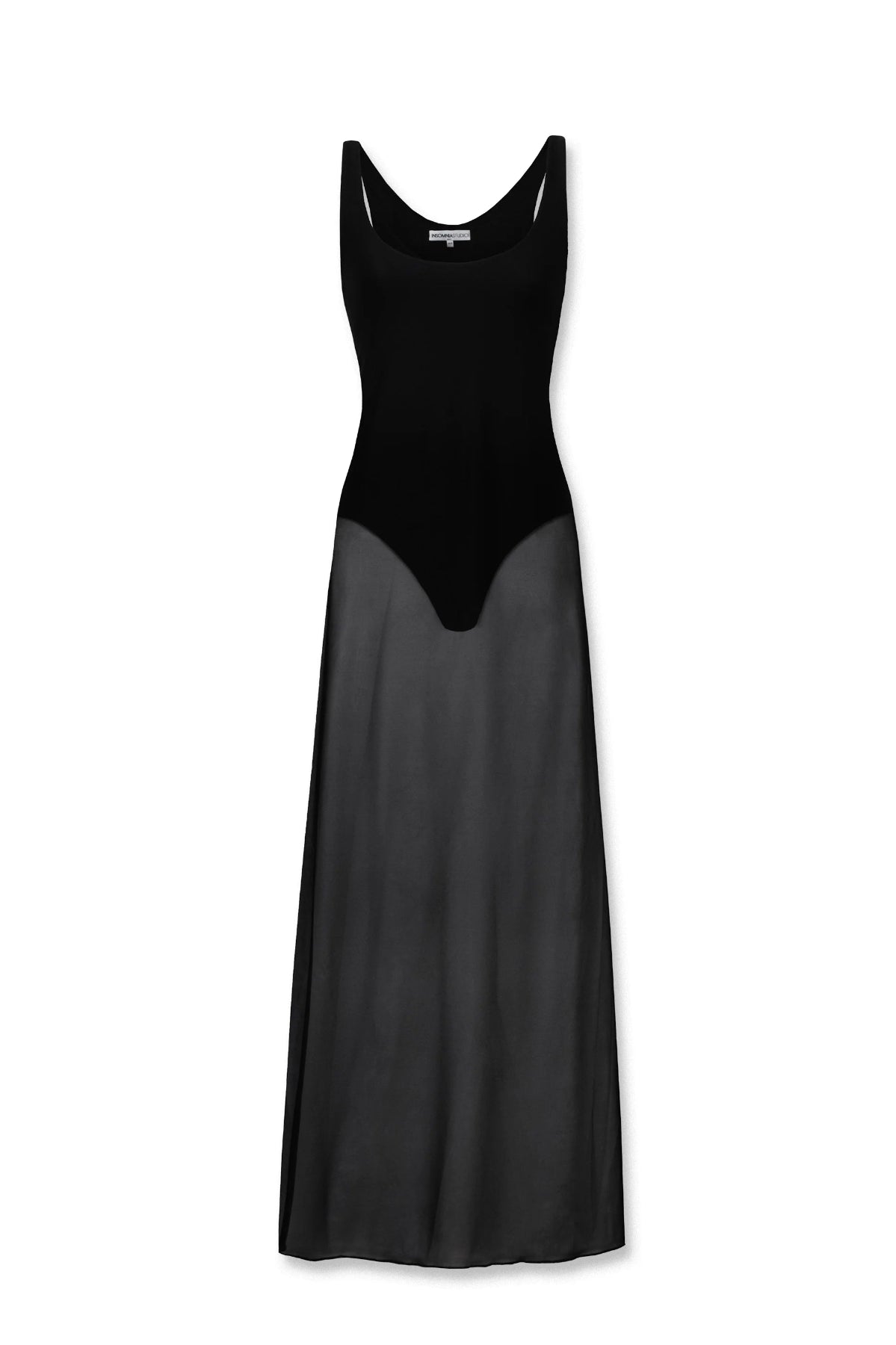 Sleeveless semi-sheer dress with an inlaid bodysuit.